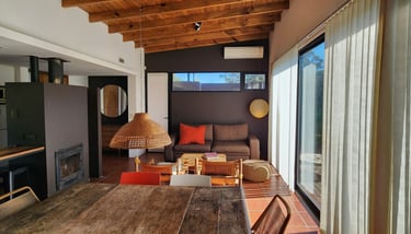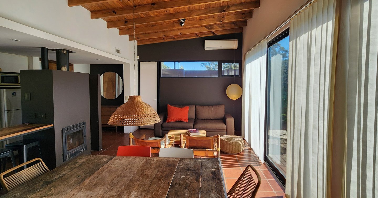 El ambiente principal integra una cocina de estilo moderno/industrial, equipada y práctica, junto a un living cómodo y bien resuelto. Cuenta con aire acondicionado para asegurar confort durante todo el año y una salamandra que suma calidez y carácter al espacio.