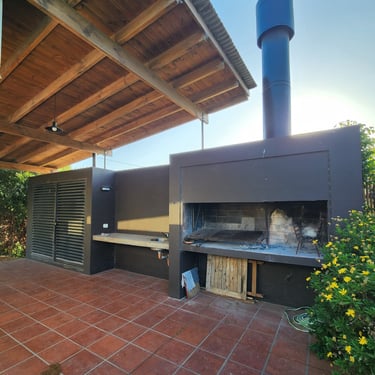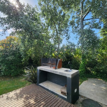 En el exterior, un jardín privado invita a desconectar, con parrilla completa, mesada y mobiliario ideal para compartir comidas al aire libre.