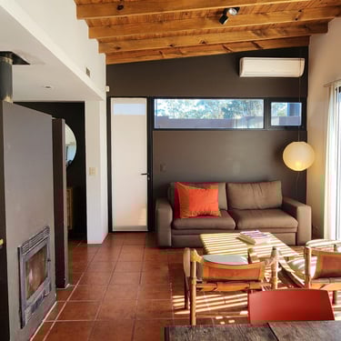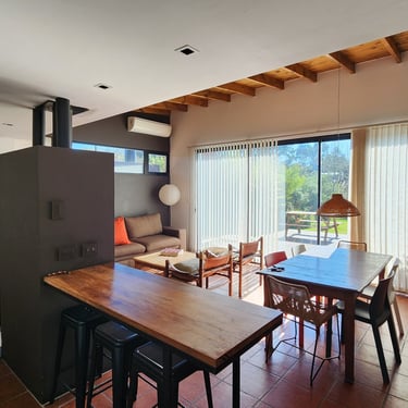 El ambiente principal integra una cocina de estilo moderno/industrial, equipada y práctica, junto a un estar comedor cómodo y bien resuelto. Cuenta con aire acondicionado para asegurar confort durante todo el año y una salamandra que suma calidez y carácter al espacio.